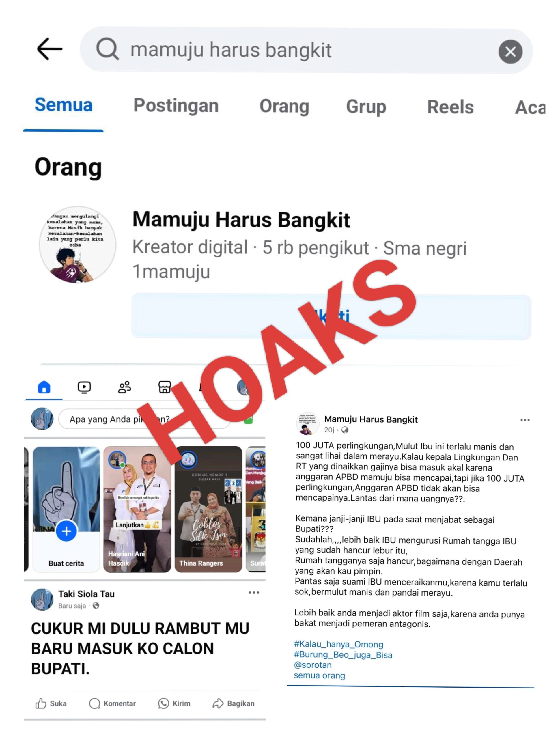 Suwarta.id, Mamuju – Menjelang hari pencoblosan Pemilihan Bupati dan Wakil Bupati Mamuju pasangan calon nomor urut 1, Sitti Sutinah Suhardi dan Yuki Permana, diserang oleh sejumlah akun palsu dan akun provokatif di media sosial.
