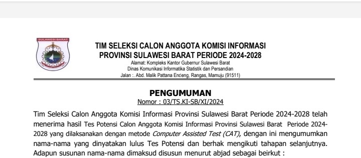 PENGUMUMAN HASIL TES POTENSI CALON ANGGOTA KOMISI INFORMASI SULAWESI BARAT PERIODE 2024-2028