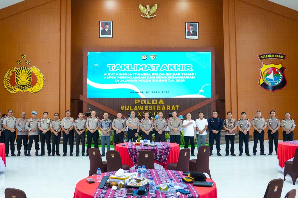 Suwarta.id, Sulbar – Wakapolda Sulawesi Barat, Brigjen Pol Hari Santoso secara resmi menutup kegiatan Taklimat Akhir Audit Kinerja Itwasda Polda Sulbar Tahap I Tahun Anggaran 2026, Jumat (10/4/26) di Aula Marannu Mapolda.